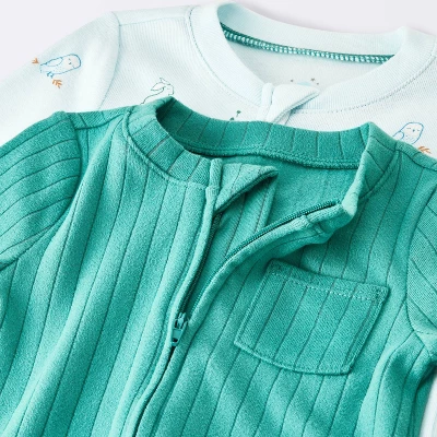 Introduce your little one to cute animals around us by dressing them in the pieces from the 2-Pack of Cozy Wide Ribbed Animals Sleep N’ Play from Cloud Island™. This pack of two sleep n’ plays includes one in solid color with a wide ribbed pattern and one with animal print for fun, everyday options. Made from recycled polyester fabric with added spandex, these pieces offer soft and stretchy comfort, and their long sleeves and footed ends provide full coverage. Designed with mitten cuffs, the sleep n’ plays also have front full-length zipper closures for easy dressing and diaper changes. Best of all, the snap tabs help prevent their chin from scratches.