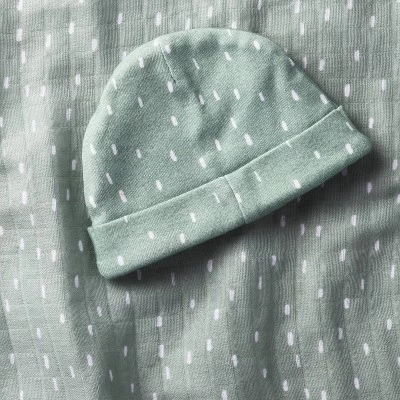 Welcome the new member of the family with this 2-Piece Hospital Muslin Swaddle and Hat Gift Set from cloud island™. This newborn gift set includes a muslin swaddle blanket and a matching beanie hat. Decorated with a white dot pattern on a muted green background for sweet whimsical charm, both items in the set are made of 100% cotton for comfortable use and are machine washable for convenient cleaning.