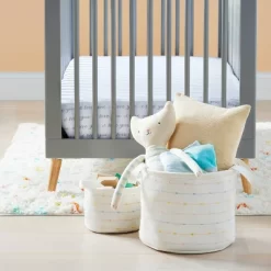 Keep your little one’s room clean and decorated with this Medium Round Bin with Slub Stitching from cloud island™. This round storage bin brings organization to your child’s playroom or baby’s nursery. It’s adorned with soft pink, blue and yellow slub stitching on a cream backdrop for sweet and dainty style. This practical bin is designed with two attached handles for easy portability, and is great for stowing toys, clothing, bath items, stuffed animals and other baby essentials.